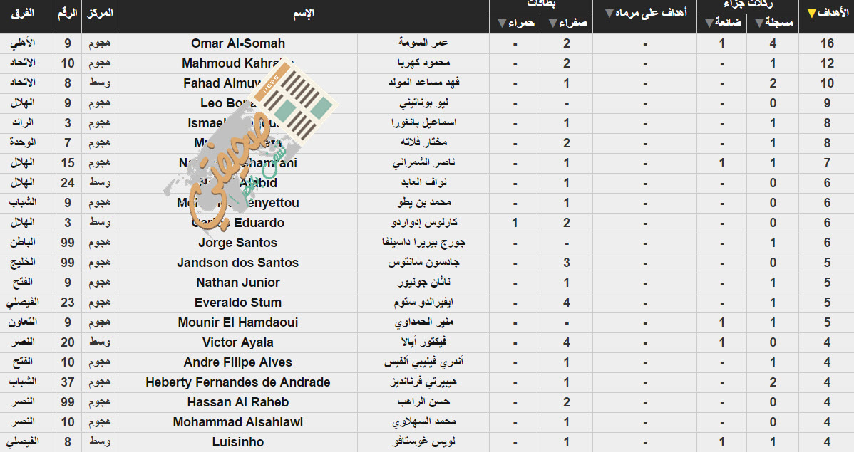 ولا يزال عمر السومة المحترف السوري في المركز الأول في ترتيب الهدافين بوصوله إلى الهدف 16 تلاه لاعب الإتحاد المحترف المصري محمود كهربا برصيد 12 هدفا وبعده زميله في الفريق فهد مساعد المولد برصيد عشر أهداف.
